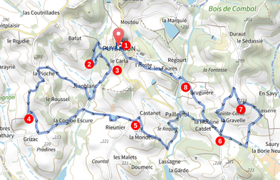 Ce parcours de 12.6km au départ du centre bourg de Puybegon (nom de l’occitan signifiant “Puech Buego” “Puy de Bégon”), offre aux randonneurs la possibilité de découvrir ce village crée en 1246 par Dame Fines Alaman sur le site du Castel de Puech Buégo. Dominant du haut de sa butte la vallée du Dadou, et surveillant les voies qui menaient à celle du Tarn, la place-forte de Puybegon, en raison de son importance stratégique et économique, fut l’objet de la convoitise de nombre de seigneurs.