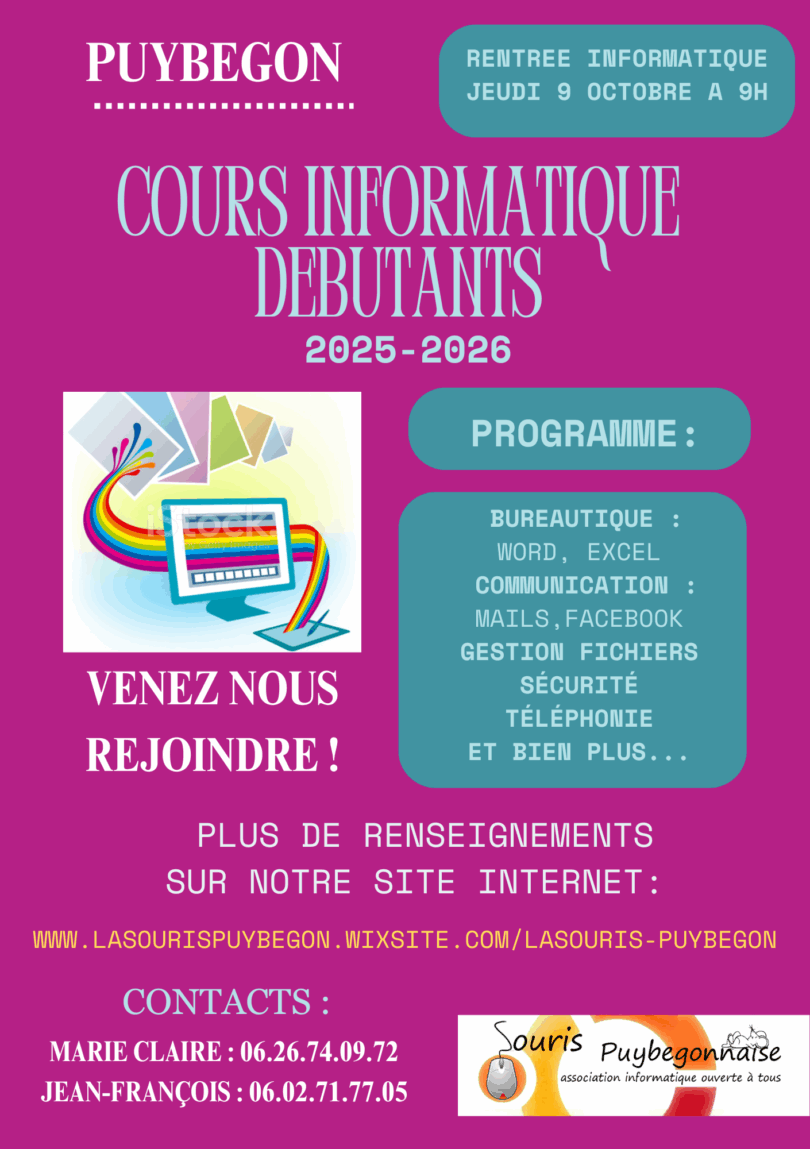Cours informatique pour débutants à partir du jeudi 9 octobre